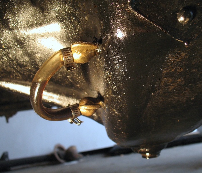 My dad was a still operator for Shell, Pathfinder, and Union Oil for forty years before he retired in 1965. He scoffed at TV commercials for all the various brands. He used to say, "It all comes out of the same pipe." He wasn't being literal, of course. It was his way of saying they're all basically the same, sometimes with dye added to make them a "special" color. Look at your oil container. Does it have the API seal? Then its contents meet the same standards as all the other brands. When you pay extra for the big brand "with XLNT added!!!", you're just subsidizing their expensive advertising. The cheapest oil with the API mark is better than what your T got when it was new, and just as good as the higher priced stuff. My own personal choice of oil was whatever 10W-30 with the API mark I could find at the lowest price. But after asking a couple of well-known Model T rebuilders who put lots of miles on their cars, I'm going with whatever 15W-40 I can find at the lowest price. I thought that would be the Walmart house brand, but the last time I checked I found that Rotella costs a little less. Oil level is checked with two petcocks on the back of the pan. Adding oil, open the top petcock and fill until oil starts to drip out. The model T holds between four and five quarts. Check with the bottom petcock. As long as oil drips out when you open it, there's enough. If none comes out, it's time to add more. Some folks use a glass oil sight gauge. I don't, for two reasons. 1 It can become misleadingly difficult to read, appearing to be full when it's empty. That is not a good thing. 2 It can be damaged by road hazards and leak out all your oil, also not a good thing. Instead of a glass gauge, I use a clear plastic tube. When I open the petcocks the oil finds its level. Of course I leave the petcocks closed, opening them only to check the level. If the tube gets knocked loose, no harm done. |