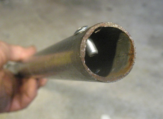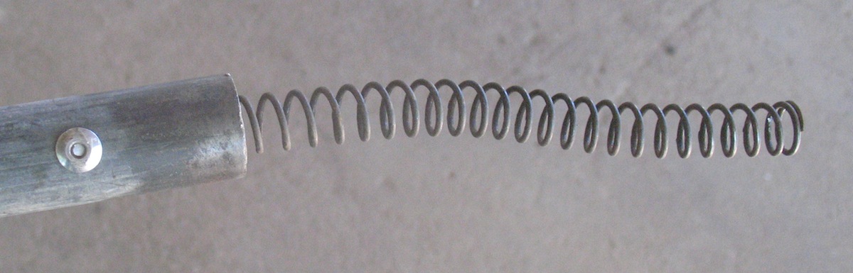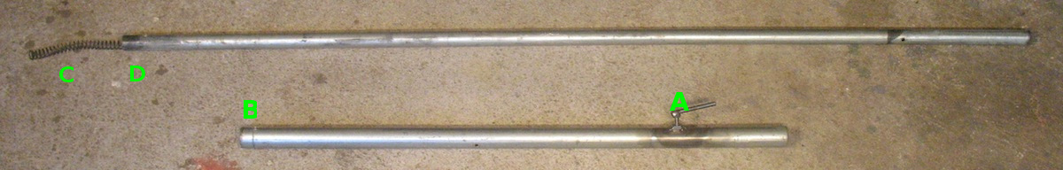 A long pop rivet (B) an inch from the end of the tube keeps the spring inside. |