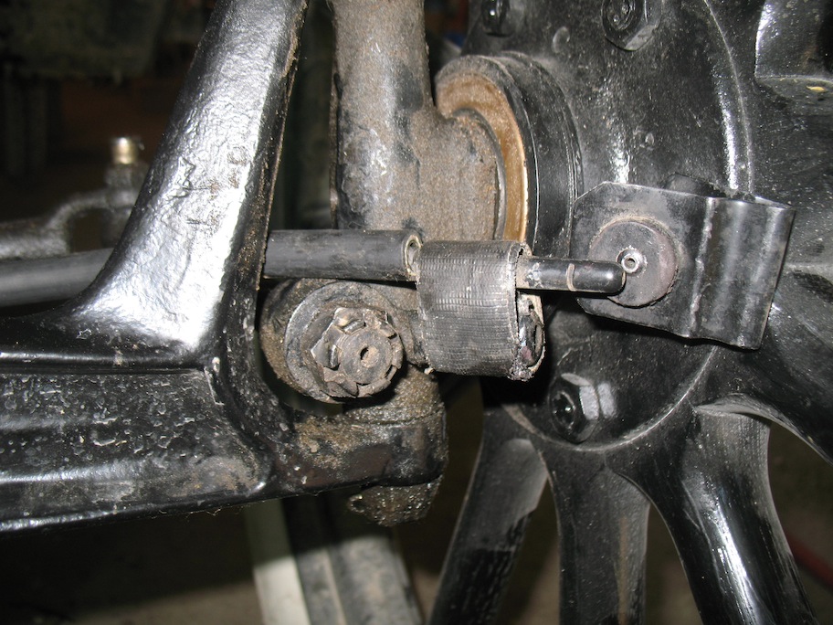 The hose is held onto the tube by tightly twisted wire, which is held by the same radius rod bolt that holds the sensor bracket. |