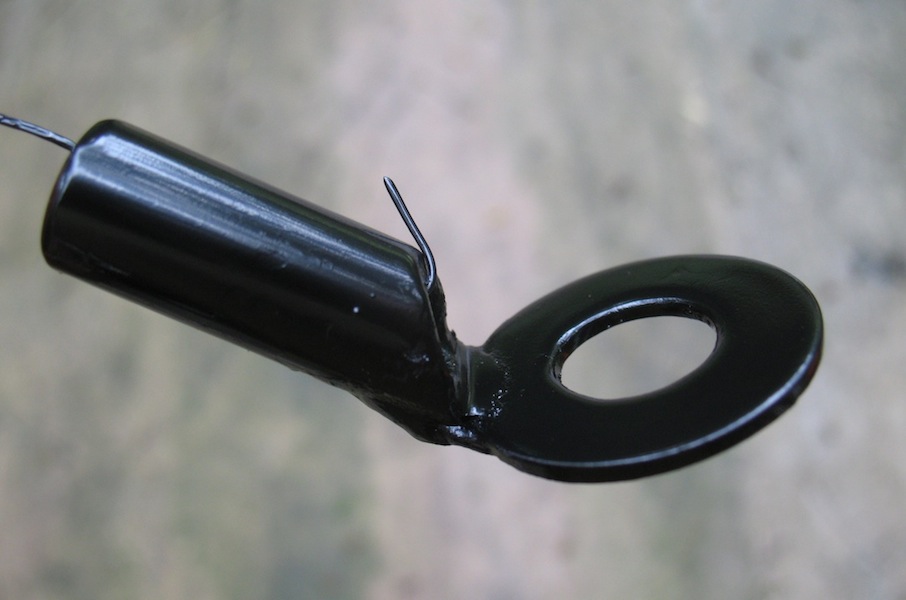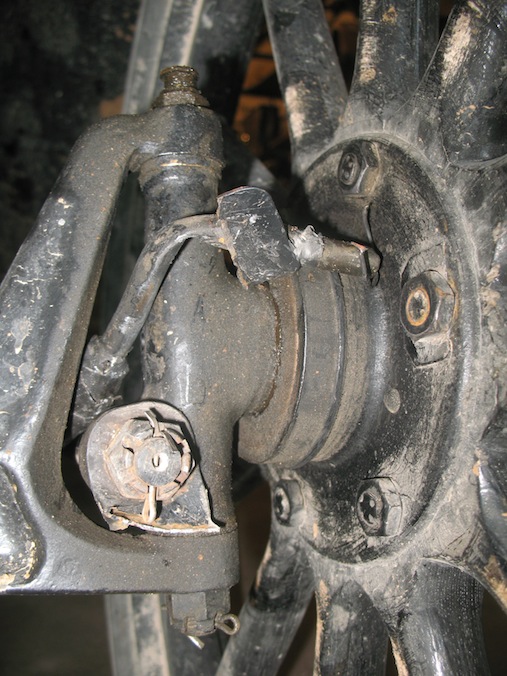 | Here's the bracket attached by the spindle nut. The sensor is mounted on it with Gorilla tape. The magnet is attached to the wheel by a hub nut. Note that the magnet mounting bracket is different from the one in the earlier picture. There have been some changes over the years as I figured out what didn't work very well and what did. This photo also shows the Achilles' heel of this speedometer. The delicate wires are easily damaged by road hazards like gravel kicked up by the wheels. Here you also see that extra wire needs to be spliced in. The wire as it comes with the speedometer is fine for a bike, but isn't long enough for car use. A few feet of speaker wire will solve that. I cover the splices with shrink tubing, which has been cut off here to show the splices and the broken wire. |