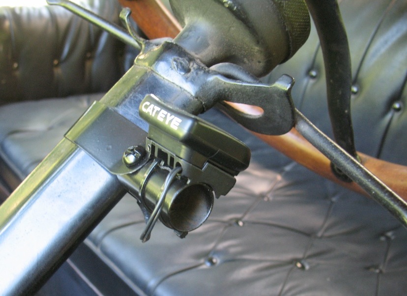 road. (9-26-2022) For the first few years your new Ford came from the factory with a speedometer. But production of the cars became more and more efficient, and they were turned out faster and faster. The speedometer manufacturers couldn't keep up, so Ford quit installing speedometers. You could still buy an aftermarket speedometer for your Ford, but a lot of folks didn't. So today many Model T's have no speedometer. If you want to install one, there are three options. You can buy an original Model T era speedometer, and it will be fine. Its drawback is the price, usually several hundred dollars. Another choice is some sort of GPS device. This has the advantages of being easy to use and less expensive. Its drawback is that it depends on being able to pick up a satellite signal. The third choice is a bicycle speedometer. Its advantages are price (it's least costly of the three options) and accuracy. Its disadvantages are delicate wires and an odometer that goes back to zero when you install a new battery. This page shows installation of a bike speedometer. I have read that some of these go haywire due to interference from nearby ignition coils. That has absolutely NOT been a problem with this speedometer. It's a Cat Eye Velo 5, and I paid less than $25 for it. In fact I've bought it twice. One is on my 1915 runabout and the other is on my 1923 touring. Here's how both are installed: |