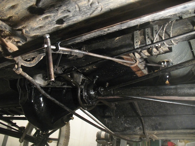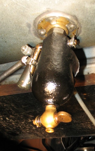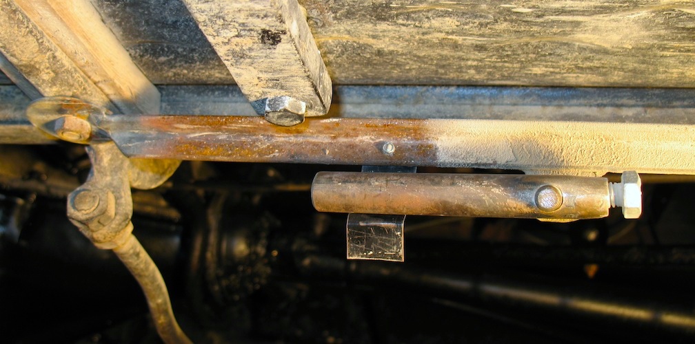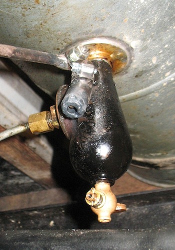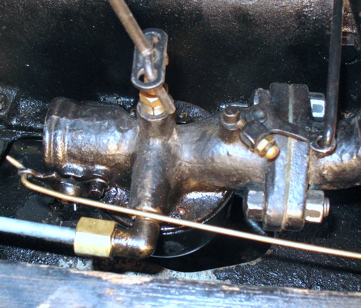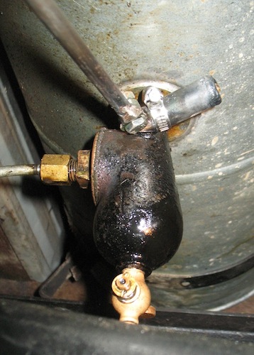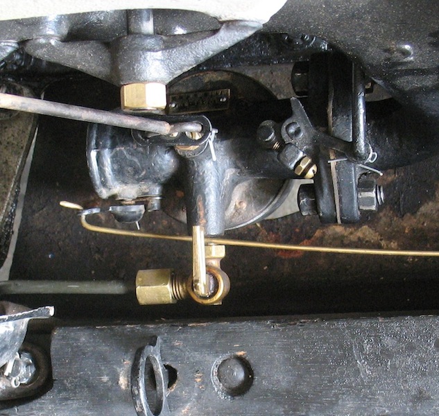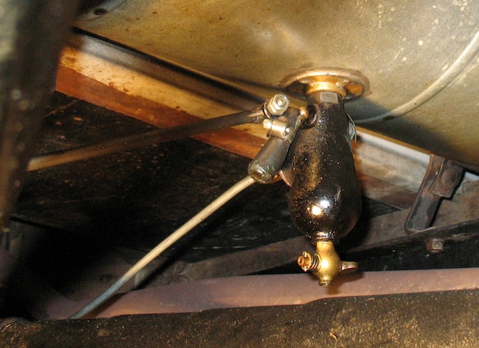So I decided to use the stock Ford inlet elbow (Part #6154) and use the sediment bulb valve under the gas tank as a shutoff. But it would be pretty inconvenient crawling under the car every time I wanted to turn the valve. So I made an accessory that lets me control the valve from beside the car. |