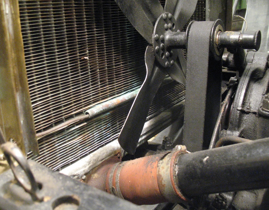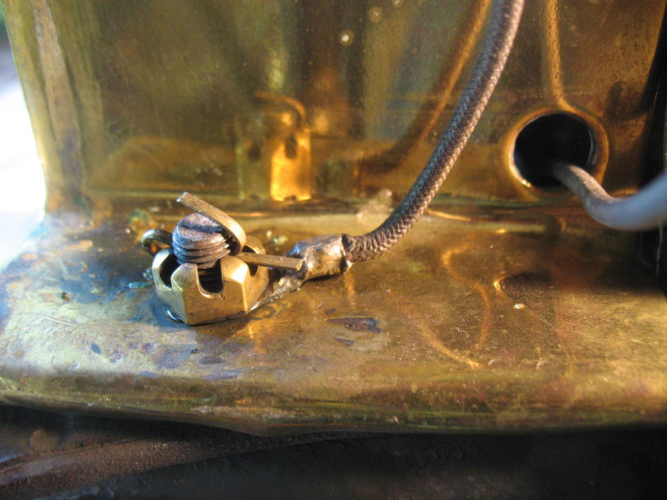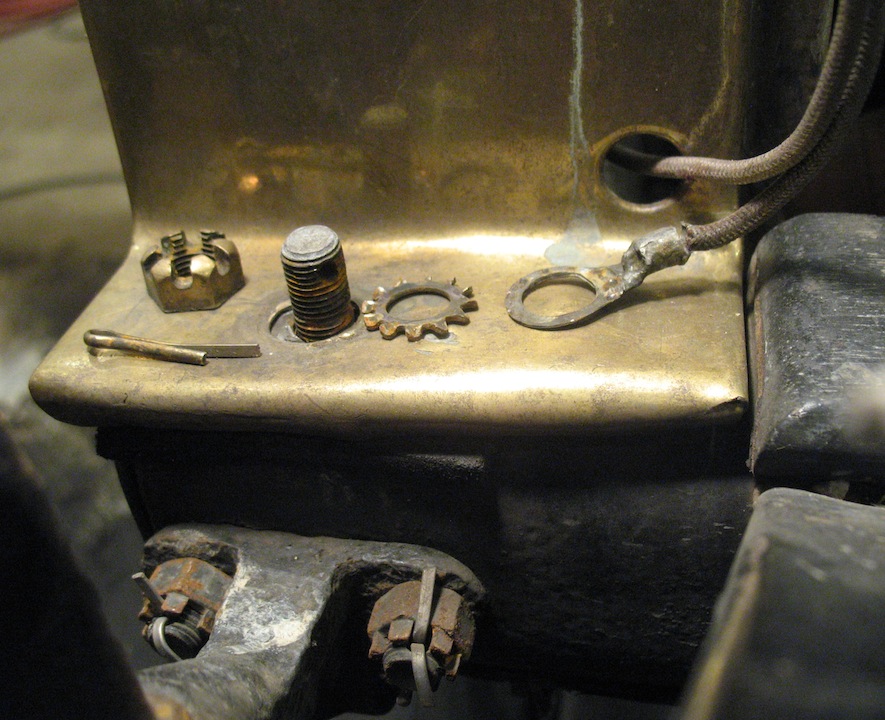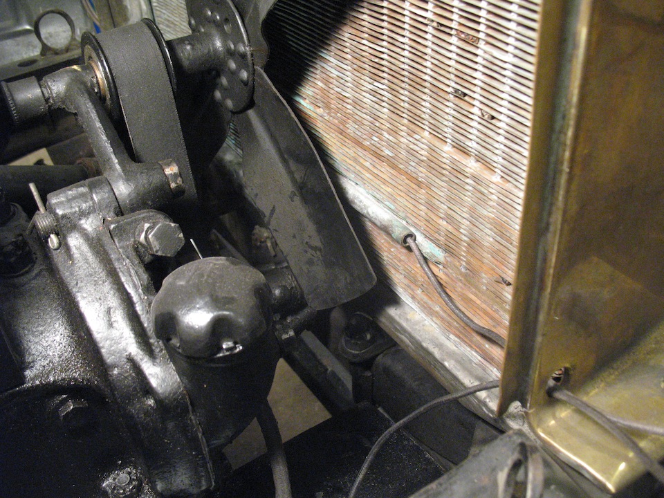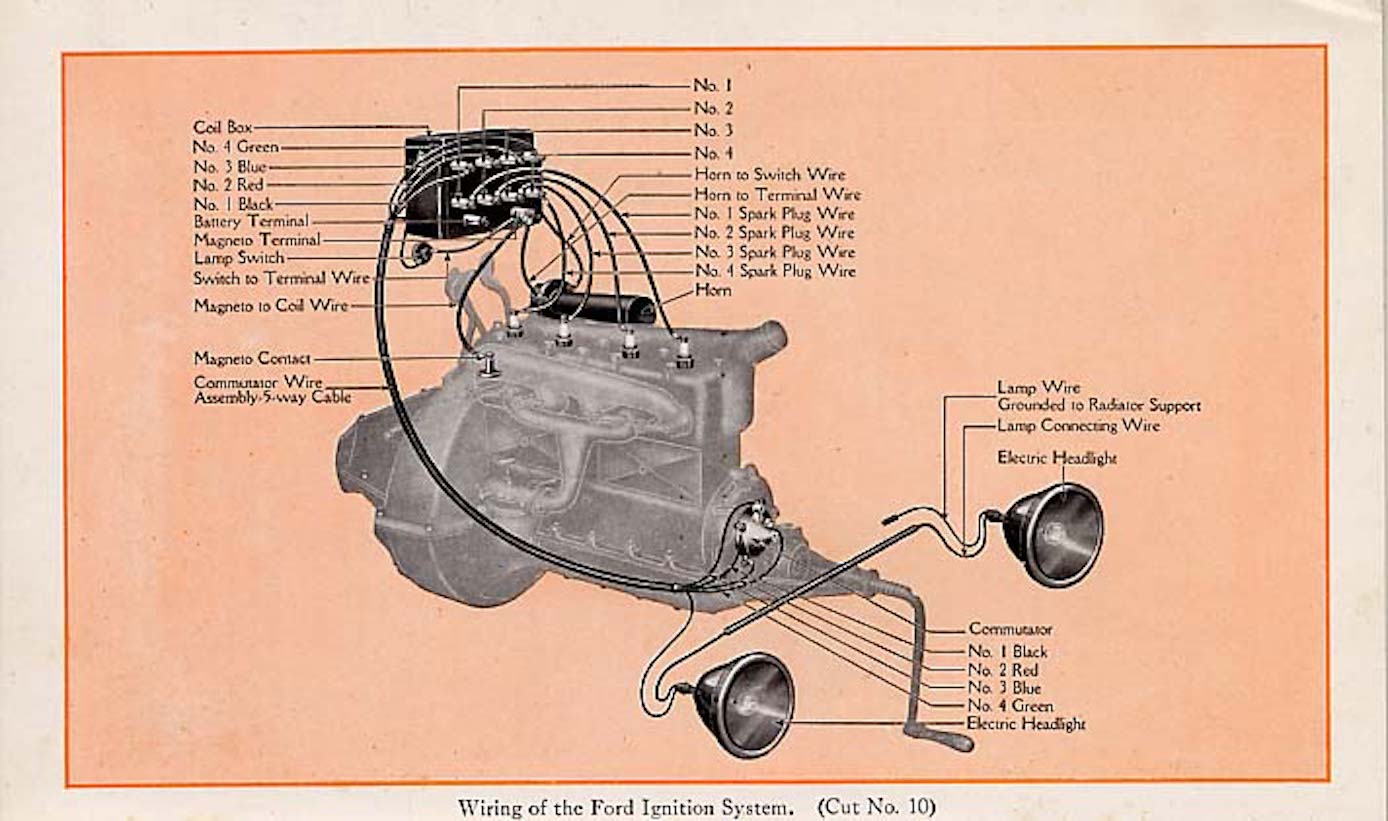 The diagram shows us that a wire from the magneto contact goes to the magneto terminal on the coil cox and is the only source of current for the ignition, horn, and lights. There is no wire connected to the battery terminal because that's how the car came from the factory. But drivers who couldn't pull the crank fast enough to generate enough current to fire the plugs could install a battery to fire the plugs for them, and a slow pull would start the car. If a battery is used in this system it powers only the ignition. The horn and the lights remain powered by the magneto and will work only when the car is running. |