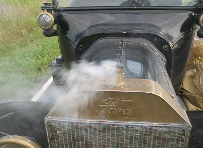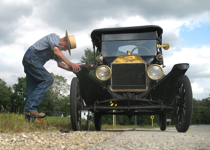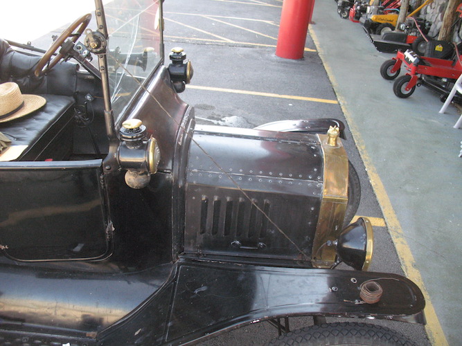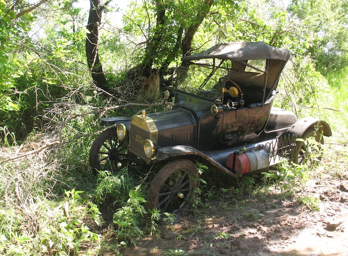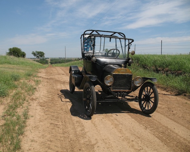The next day, west of Springfield MO, I experienced my next event. The farther I went, the rougher the engine ran and the more it lost power, until the car was struggling up hills and slowing to a crawl at the top. Fortunately most of the way across western Missouri is relatively flat. The sun was setting as I limped into Carthage. I pulled into a gas station, left the engine running, and phoned Mike Bender. “Can you hear this?” I asked. “Sounds like it’s running on two or three cylinders,” he replied. Mike drove up from Tulsa with a trailer in case I needed to haul the car, but the spare parts he brought contained the cure for what was ailing my car — a good timer brush to replace the one I had which was worn out. The next day I should have made it home early in the afternoon, but there was another event. This one was directly my fault. I failed to check tire pressure all around, and about thirty miles from home I was rounding a curve on a gravel road and suddenly heard the sound of a bare rim running on the road. I was prepared for changing a tube, but not for losing a tire. I walked back along both sides of the road a couple of times and never did find where that right front tire went. I phoned my cousin to come and fetch me, and while I waited I searched for that tire three or four more times. I never found it, and we ended up enlisting a friend with a trailer to haul the car home. Have all these events