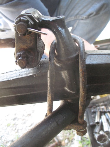 Event Two was the culmination of a failure long in coming. For many years, unseen from the outside, rust inside the windshield frame had been weakening the upright on the right side. Blasts of air from big trucks passing in the opposite direction finally broke the weakened upright, and of course cracked the glass. Using the traditional universal Ford repair kit (baling wire) from a farm supply store, I improvised a temporary windshield support.