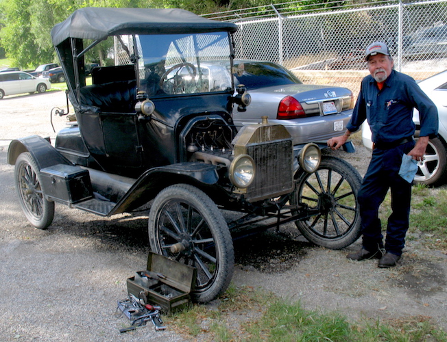 OK, back to the narrative. With a spare tube installed, I continued northward. After awhile the car got weak and struggled on hills. The reason was that it was running on three cylinders because a spark plug had failed. Replacing the bad plug, I drove on to Concordia with no further troubles. As I would be camping in the city park for more than one night, I brought a tent to hold my place. The tour was interesting and fun, and on the last day I headed home. There was not a hint of trouble until I was about thirty miles from home. I was crossing a bridge when suddenly I heard the sound of a bare rim on pavement. I had blown a tire. On the trip north the left rear tube had failed, and now on the return trip south the right rear tire was gone. I suspect that was also because of a failed tube. I later learned that there was a run of Custom Classic tubes that were prone to splitting, and apparently I had gotten some of those when I bought tubes. I walked along both sides of the road looking for the tire. I never found it, and not having a spare tire I phoned my cousin to come and fetch me. The next day we came back with another rear wheel that had a tire on it and I drove the car home. Undeterred by my tire adventures, I applied to attend the Old Car Festival and was delighted when my car was accepted. But as the time to depart drew near I was having misgivings about driving hundreds of miles by myself in a car over a hundred years old. I told Mike Bender about my apprehension, and he reminded me that wherever you go in this country there are likely to be Model T people not far away. |