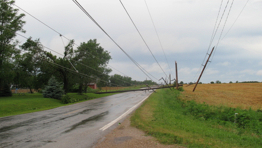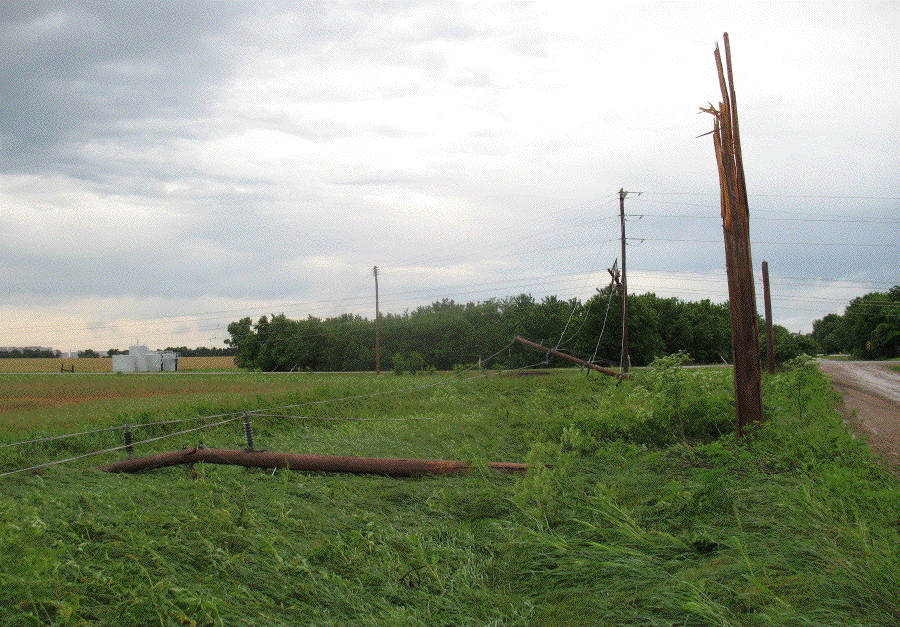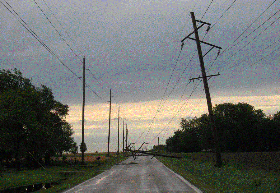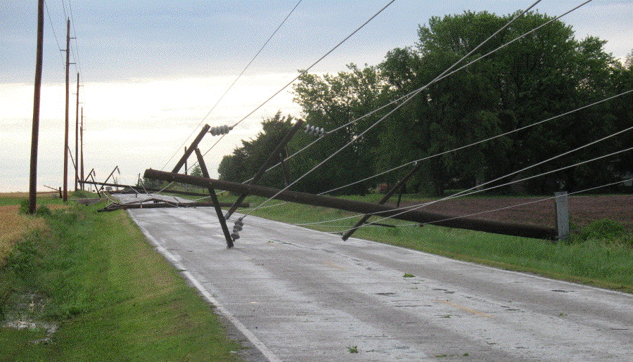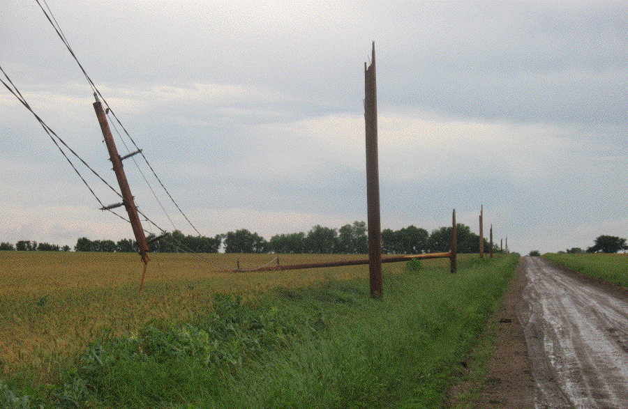 During the night the rain fell, the wind blew, branches flew, and the power went off. When I got up I dressed and ate breakfast by kerosene light. The power came back on in this area just as I was driving down the road toward town. The north end of town was dark. When I got to work we waited a couple of hours for power, then gave up and left. I drove around north of town for awhile and found that we needn't have waited. The pictures tell the story. I wouldn't be surprised if it takes several days or weeks to get things back to normal.