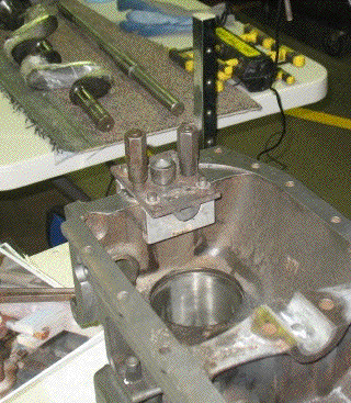 The boring shaft is set into the bearing and the jig is clamped in place.