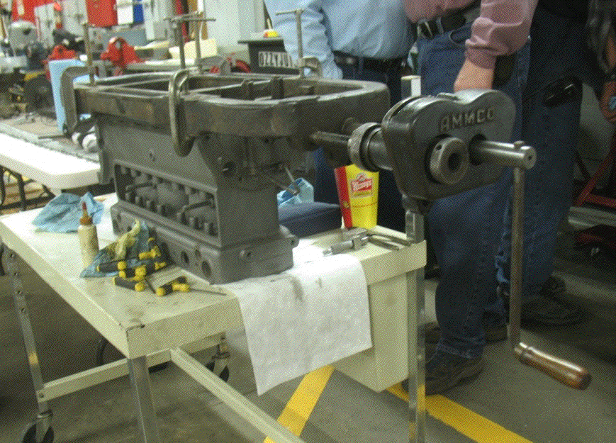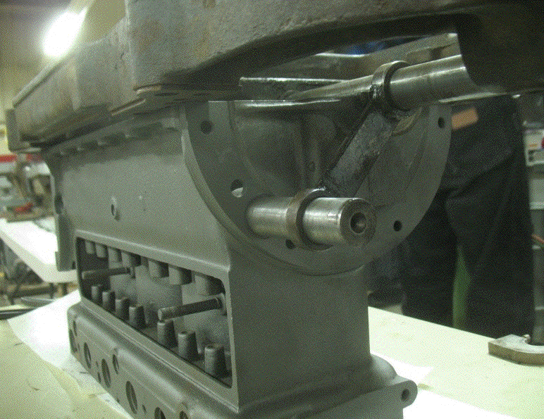 The crank on the right turns the shaft to bore the bearings, and the threaded shaft on the left pulls the boring shaft forward.
