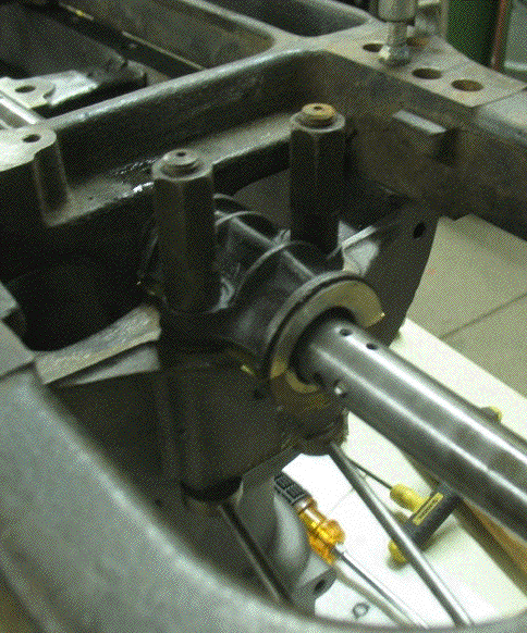 A bearing cap is bolted on to be bored along with the bearing. In front of the cap and bearing, the cutting tooth can be seen protruding from the side of the shaft. The hole above it is where a set screw holds it in place. |