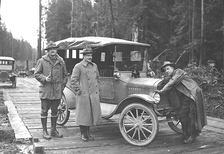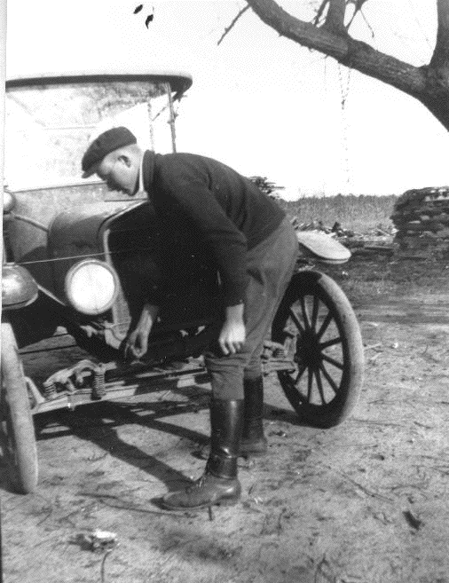 Gadget bred gadget. Owners not only bought ready-made gadgets, they invented gadgets to meet special needs. I myself drove my car directly from the agency to the blacksmith's, and had the smith affix two enormous iron brackets to the port running board to support an army trunk. |