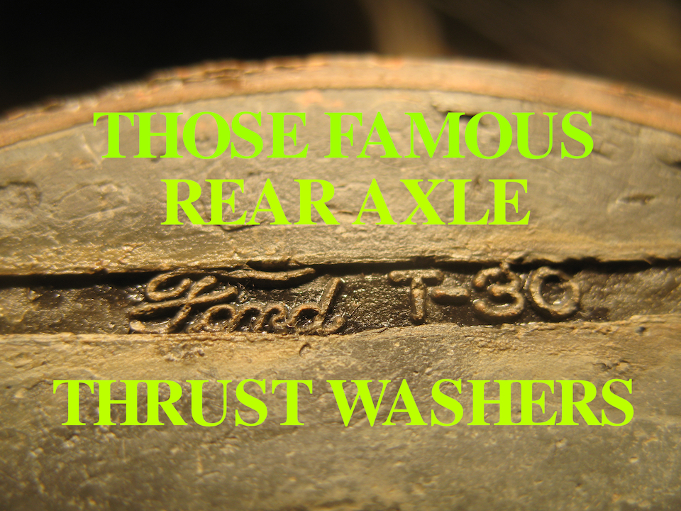 Without much Model T experience, I was blissfully unaware of the problems often caused by original rear axle thrust washers. These washers, spacers which keep the differential and rear axles centered in the housings, were originally made of a Babbitt material which over the decades becomes brittle and eventually disintegrates. The loss of those thrust washers allows the axles and differential to shift sideways, which presents some serious potential problems. I knew nothing of this when I was driving down the street and my right rear wheel seized up. I got the car off the street, managed to put it on a trailer I brought from home, and hauled it away. |