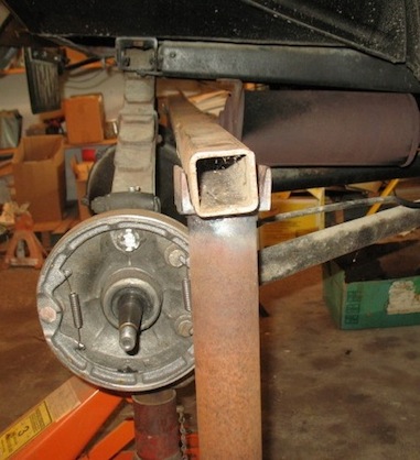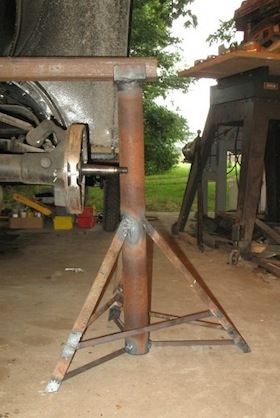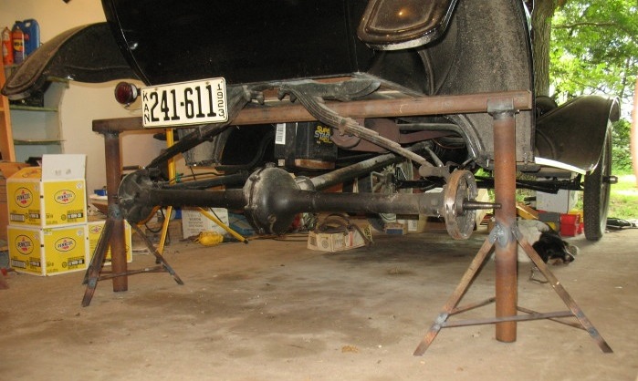 tells how to do the job. Before going on with more about rebuilding the rear axle, let's be clear about why this is important. When those thrust washers disappear, the differential and rear axles can shift to the left, pulling the hub nuts and bolts into the brake shoes and making the kind of mess pictured above. But wait, that's not all. In fact, it's a minor inconvenience compared to what else can happen. As the differential shifts to the left, the ring gear becomes disengaged from the pinion. At this point the wheels are no longer connected to the engine and transmission, and the car is freewheeling. To make this even more exciting, you no longer have a foot brake. Very disappointing things can result. There are other symptoms than rear brake destruction that may indicate thrust washer failure. Sometimes there's a click, a thump, or a grinding sound, especially on turns. Sounds can travel on a T, and it's not always obvious where the source of the sound is. Sometimes people think it's coming from the transmission, or even the engine, when it's actually from the rear axle. So anytime you have a Model T and don't know whether the babbitt thrust washers have been replaced, the wisest course of action is to open up the rear end and find out. A good way to support the vehicle when you remove the rear end is with a six foot piece of heavy two inch square tubing. Supported by a pair of stands, the tubing goes under the frame, behind the muffler. The stands will be just forward of the axles and present no obstacle when you pull the rear end back from under the car. |