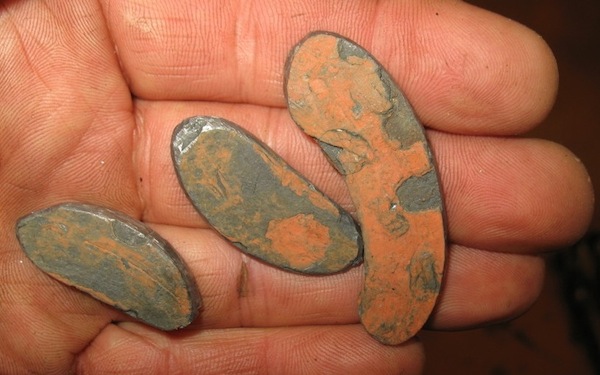 Here's the inside of an axle housing after the old babbitt thrust washers have done their thing, and the biggest remaining chunks of the old washers, and an original thrust washer with its new bronze replacement in front of it. |