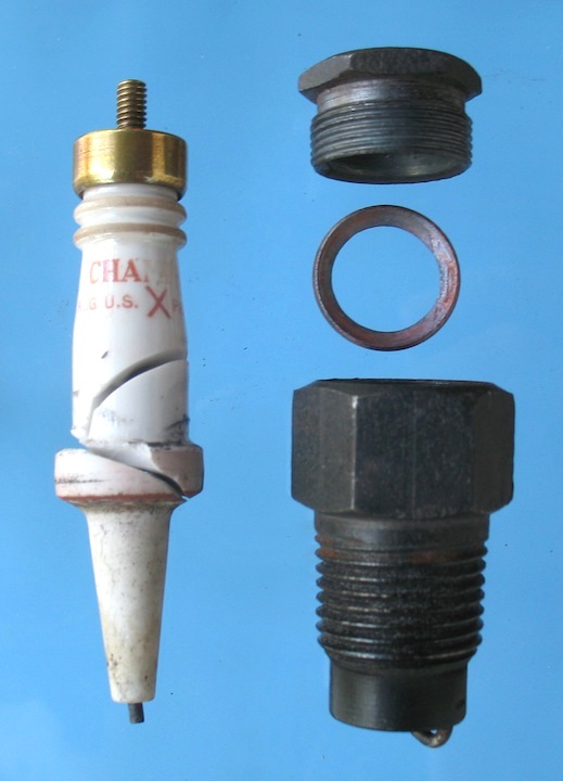 Here's an unusual early plug. The base is steel, but the collar is brass. |
