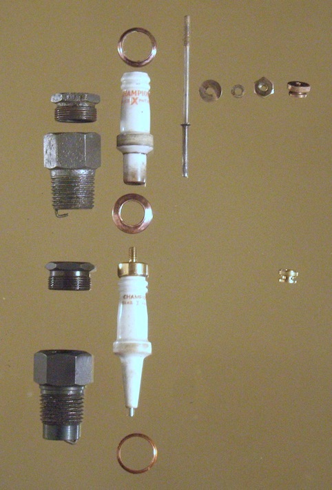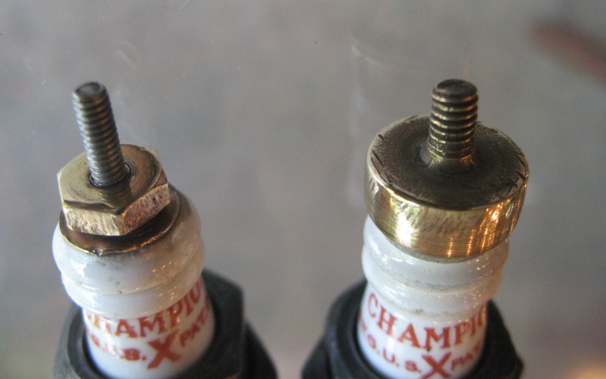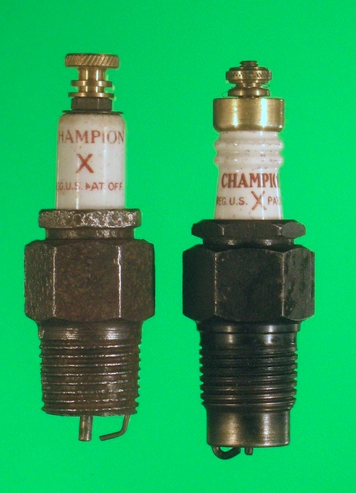 All X plugs fall into two basic groups – the early plugs made in the teens and early twenties (left), which can be completely taken apart, and the later "brass hat" ones that can't. |