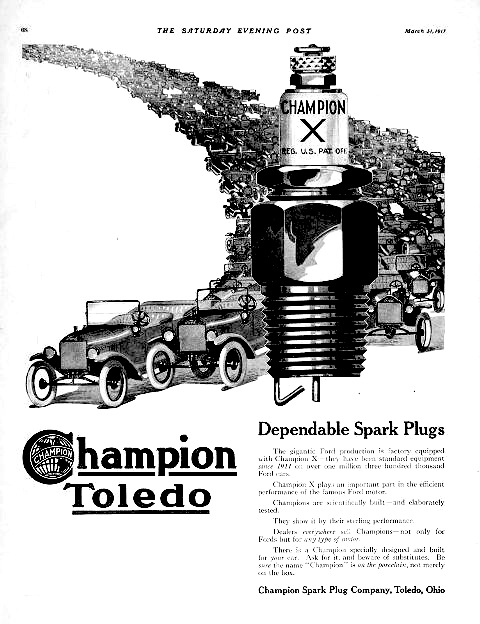 ![]() Like the Model T itself, the Champion X plug changed over the years. They're not all the same. Some folks are very meticulous in making everything on their cars "correct" for the year. If it's in good condition, any Champion X plug made in the past hundred years or so should work in any Model T. But if you're going for all the correct parts on your T you'll want to find plugs appropriate to the year of the vehicle. It took Ford about six years to produce the first million Model T's. The second million took about a year and a half. By 1921 they were making a million Fords a year, and in 1923 produced two million. The greatest volume of Model T production being in the twenties, it follows that today plugs from the twenties are most common and the earlier versions are harder to come by. But the production of over three million Fords during the teens means there were twelve million plugs on the cars, not counting the millions more sold as replacements. So even the earlier Champion X plugs can be found with patience and vigilance. |