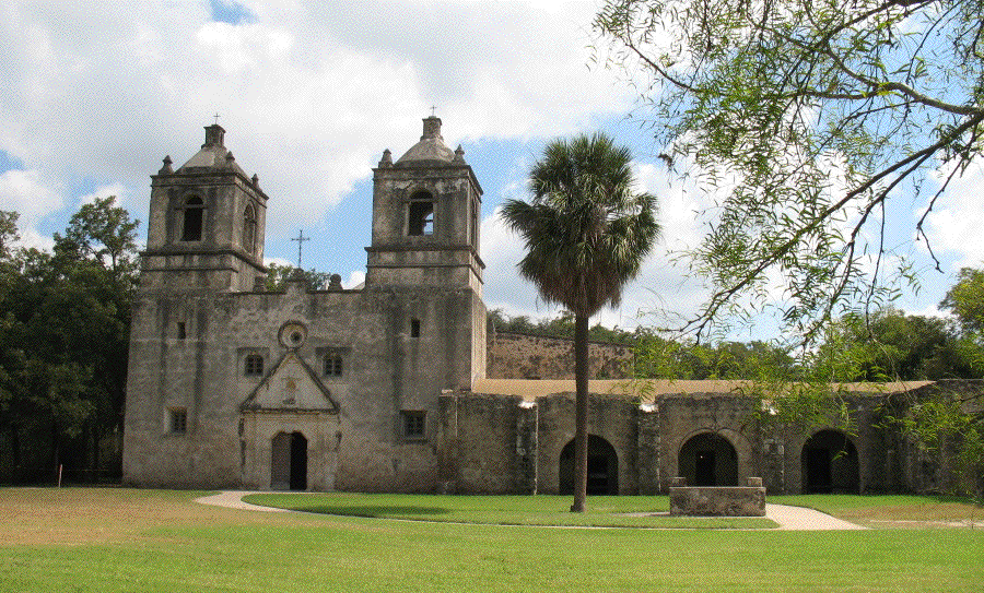 Wow! Did I get sidetracked! First it was a family reunion on Friday the Fifth and Saturday the Sixth. After getting ready came the reunion, which was good fun for a couple of days. Then came Sunday, spent going through old family pictures for cousin DorisAnn to scan, then a week of various little chores after work and evenings of snoozing off early. Then came yesterday. I flew down to San Antonio for a concert. I went to hear my favorite singer, and had a grand time. I spent the afternoon on a little sightseeing. The first sight was Mision Concepción.