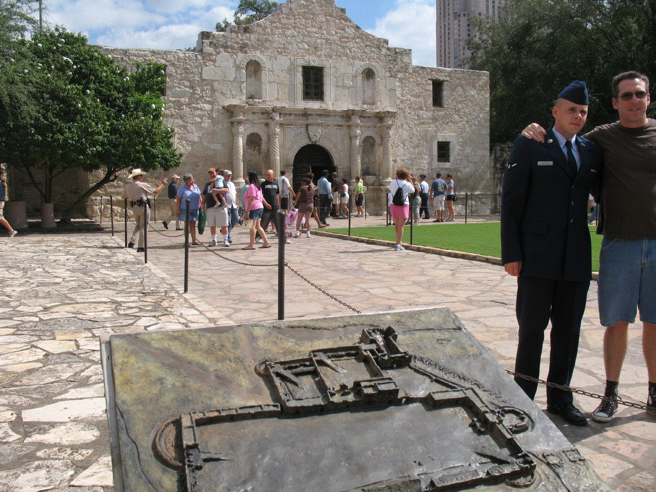 Here's the most famous of the San Antonio missions. It's the Alamo, sacred ground in the fight for Texas independence. On a Saturday afternoon it's swarming with visitors, many of them posing in front to have their pictures taken. In the foreground is a model showing the Alamo at the time of the famous battle in 1836. As the model shows, the church, at the upper right, was never finished. As they did in the three adjoining walled compounds, the defenders constructed a ramp in the unfinished building to support a cannon. In later years the walls were finished, a roof was added, and the old church became a shrine to the memory of the gallant defenders.