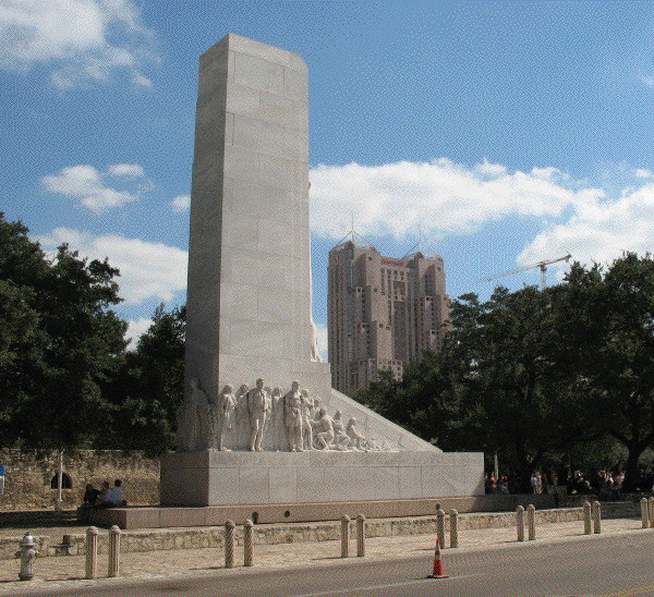 A monument to the Alamo defenders stands by the street in front of the old church. |