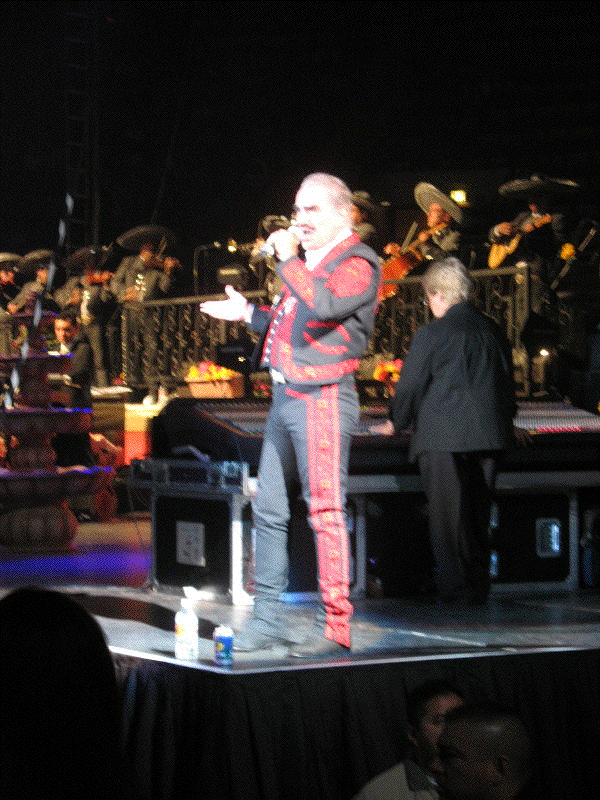 Then came the headliner, the great Vicente Fernandez. He sang for nearly two and a half hours, and still didn't get around to all his hits. He had the people on their feet several times during the show. On many songs, all it took was three or four introductory notes from the mariachis for the audience to recognize the song and burst into cheers. Several times Don Vicente took turns, singing a couple of lines and then having the audience sing the next lines. For decades, all singers have used microphones. But twice during the evening Don Vicente lowered the microphone to his side and showed how he could fill the coliseum with his voice. It was a grand evening, and well worth the trip to Texas. I'll be watching the concert schedule so I can go see him again. |
