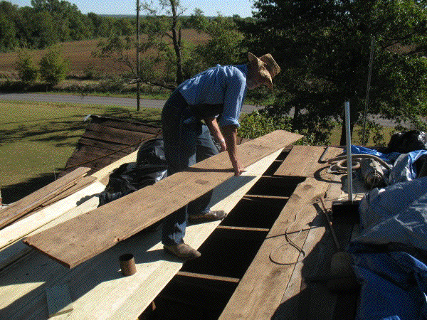 With a good chance of overnight rain in the forecast, I spent the afternoon taking old boards down from the roof and stacking them on the front porch. I want to save them for future use. Most are in bad shape, but a few are good enough for use on other projects.
