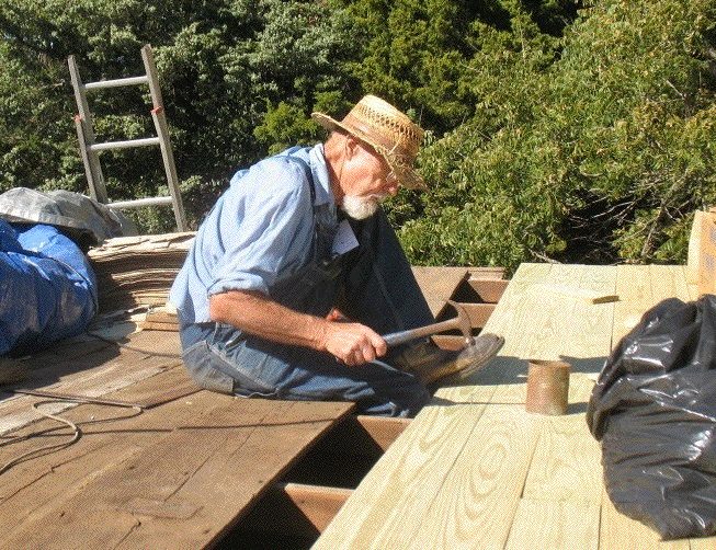 I did some surgery this morning. It seems my left hand picked up a splinter yesterday when I was working on the roof. When I noticed it hurting today it was time to get a pin and dig it out. Meanwhile the roof work continues. Today I did more work on the east half of the north end overhang. A couple more sessions should be enough to wrap up that little chore.