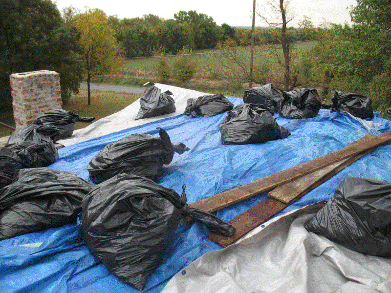 I spent a great day on the roof. I finished nailing new boards on the east half up to about a foot from the top. I'll leave the top until I get the west side done that far too. I laid out the tarps on the east side and moved all the bags of old roofing there to hold them in place, then uncovered the west half and started removing old roofing from that side. By 5:00 PM, quitting time, I had removed all the old roofing from more than half the west side. Happily, the forecast is for ten clear days with zero percent chance of rain, so I should make some more good progress.