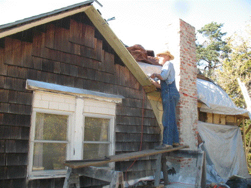 Today I got back to the roof. All I had time to do was remove some of the old boards stacked up on the west half of the upper roof. I hope I'll have time tomorrow to take off more old roofing.