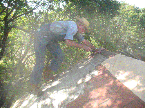 It's kind of like being in Kansas. Wind today, wind tomorrow, wind Saturday. That doesn't keep me from working on the roof, but it does slow me down a bit, having to anchor things down or stop work to retrieve my hat. I gave up on the hat and switched to a cap. That didn't keep the trash barrel from blowing off the roof, or a can of nails from blowing over and spilling down the roof. I did make a little bit of progress in taking off old roofing, but there's a lot more to do. To be continued.