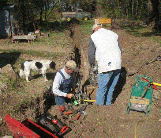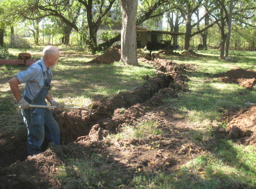 Hand digging continued this morning, and it produced more excitement than I expected or wanted. Digging near the house with a pick I punctured the plastic gas line. So I had to call the gas company and have them send out a crew to fix the leak. While the gas guys were working on the leak, a fellow from the water district showed up to work on the meter. A fitting had broken and water was gushing out of the line and flowing out of the meter hole. The water man fixed the leak by the meter and left, and the gas company guys were finishing up when my cousin Wally showed up with news. His mom was turned away by both the local nursing homes because they didn't have room, they said. Wally thinks it's because they were afraid she'll run out of money. It turned out that this was a good thing, because she wound up in a place in Oxford that Wally thinks takes better care of her, at a much lower cost. So my last job of the day before going to town to buy pipe and fittings was to send out an email to all the relatives to give them Irene's new address. Meanwhile, back on the gas front, there's more digging to do. I expect to have it all done by Monday, and ready for the new line to be installed.