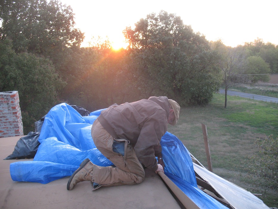 doing, I was up on the roof removing tarps. A little before nine I had