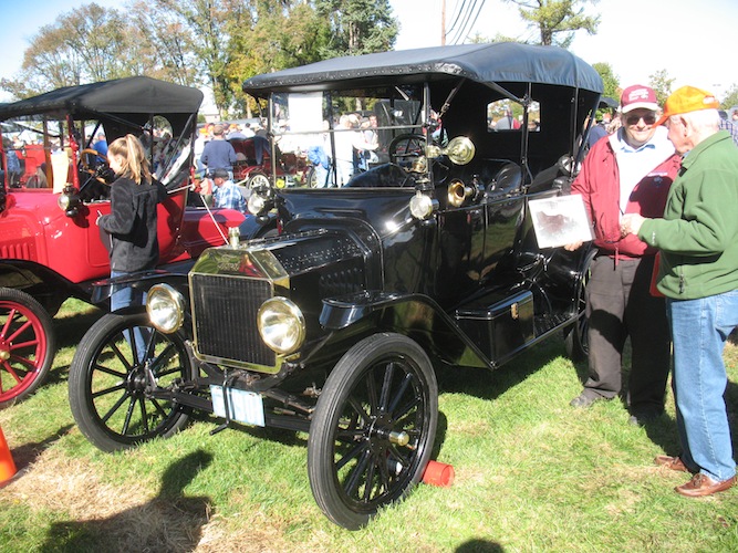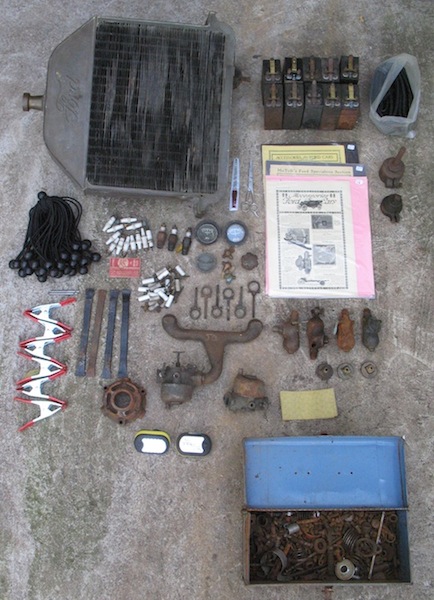 My Hershey haul: early 1911 radiator; ten Model T coils; spare 30 x 3 inner tube; 50 bungees; NOS spark plug cores; three Champion X spark plugs; two ammeters; 96 pages of Model T accessories from teens issues of MoToR; two rear hub pullers; gas cap; three petcocks; 1914-1915 oil filler cap; two Phillips bits; six shop clamps; four tire irons; NOS differential case; coil box insulators & hardware; six hood clamps; two Holley Model G carburetor bodies with intake manifold; sediment bulbs & parts to make a couple of good ones; five 3" x 6" sheets of brass cloth for screens; two emergency work lights; a box of miscellaneous nuts, bolts, and other old hardware ($1). |