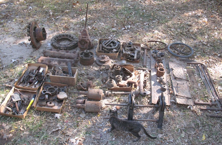 Tommy the cat has to inspect my haul. The Muncie transmission may have been a great buy, or it may turn out to be $20 wasted. I'll find out when I get into it and see what's inside. |