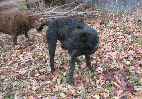 MMmmm, yummy! This afternoon Zeke found part of a deer head. Unfortunately, his friend from down the road decided it should be hers, and she took it away from him. It seems friendship ends where the deer head begins. She's bigger than he is, so there wasn't much he could do. While this was going on, I was bringing wood up to the house. I hitched the little garden trailer to the tractor and went to where the truck's stuck in the mud, and got the wood out of the truck. The big activity of the afternoon was bringing up the wood and splitting it. It looks like that truck is going to stay put for quite a while. It's in an area so wet that there's standing water in the ruts. After rain tonight, the forecast is for six out of the next seven days to be sunny and dry. Maybe that will help.