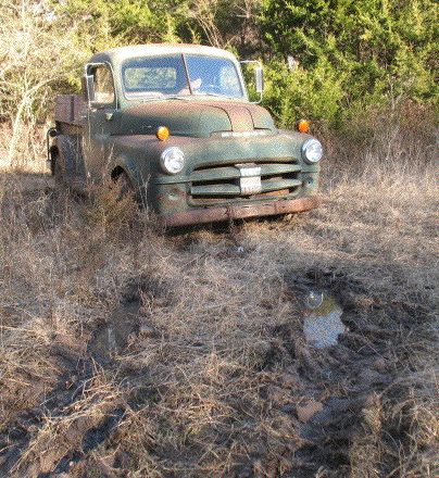 Harumph! I was going to use the tractor again to get the truck unstuck, but the ground is so muddy in front of the truck that the wheels just spun and dug in. I'll wait another day for things to dry a little, and try again with a longer chain and the tractor on dryer ground.