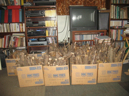 I made it home by 3:15, checked email and the weather forecast, and started on firewood. I filled several boxes with what I cut yesterday, took them into the house, cut some more, and boxed that and brought it in. By the time I quit a few minutes before five I had enough to last for a few days until the new show is gone. The forecast is for six to ten inches overnight, but these things seldom go as predicted, so we'll see.