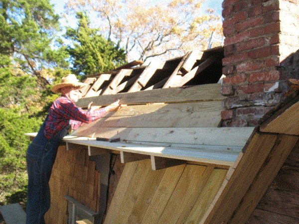 Did get to the roof today. I removed a row of old boards from the upper roof (where you see me in the second picture above), and got a good start on cutting and nailing on new boards.