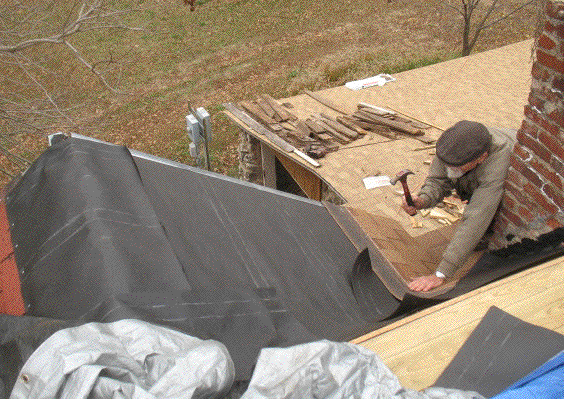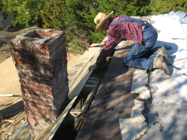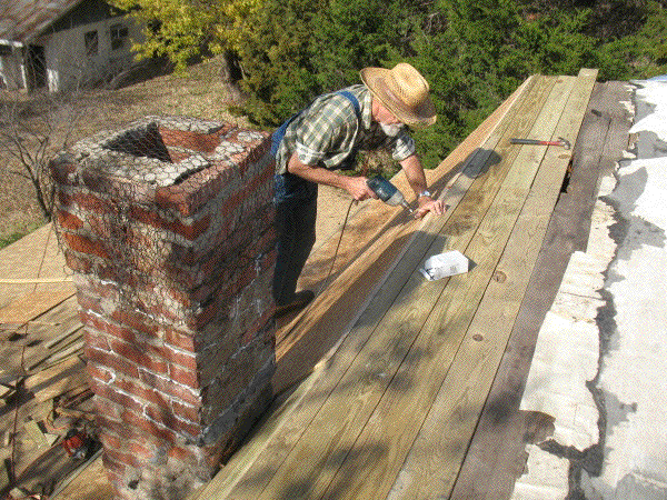 I spent another long day on the roof. I cut and screwed on the last of the sheeting on the west roof and nailed on the metal roof edge. The last part of the actual job I did was cutting and fitting metal flashing around the chimney and sealing it with roof cement. Then I spent a couple of hours quitting. With a 40% chance of rain in the forecast, I had to prepare for the possibility. If I didn't, it would rain for sure. First I tacked on temporary tarpaper around the chimney and on the south half of the west roof, then I arranged two large tarps to cover the upper roof. It was almost six when I finished, and dark. It took twenty minutes to get all the tools and equipment off the roof and put away, and I was done for the day. In the next week I hope I can get the roofing on.