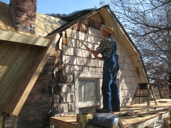 Uh-oh. The tarp arrangement that's been keeping the rain out isn't adequate in a strong west wind, which is what we had today. I went up to nail more shingles on the northwest wall and found that some of the tarps were out of place. They did fine when the wind was from the south or the north, but I'll need to make some changes in case of west winds. I'm just glad I found out about the problem in dry weather so I can take care of it before the next storm.