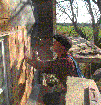 Today I bought a couple more bundles of wood shingles, and when I got home I put more up on that northwest wall. The two bundles cost $106.72, and I commented to the salesman that I'm so old I can remember $6 a bundle. He told of recently finding a receipt from 1966, when his father bought concrete at $8 a cubic yard. Now it's around $70 a yard. Better do your building now, before everything goes up even more. I got most of the wall done this afternoon, and I expect I should have it finished and treated with water seal this week.