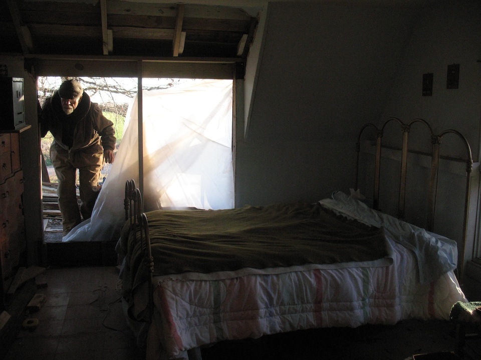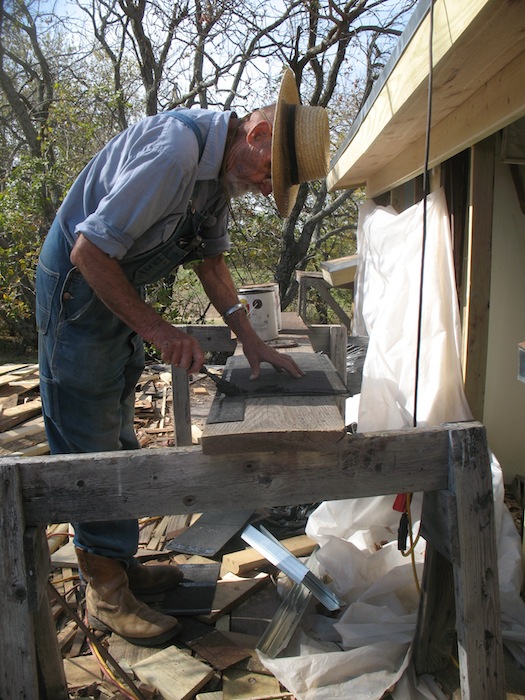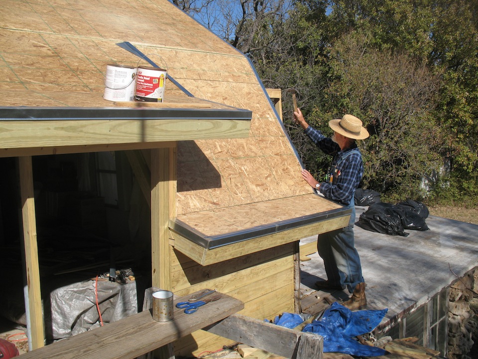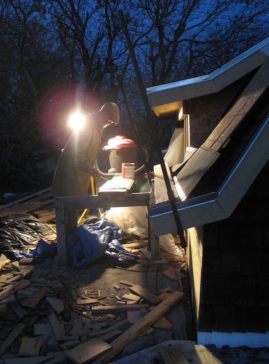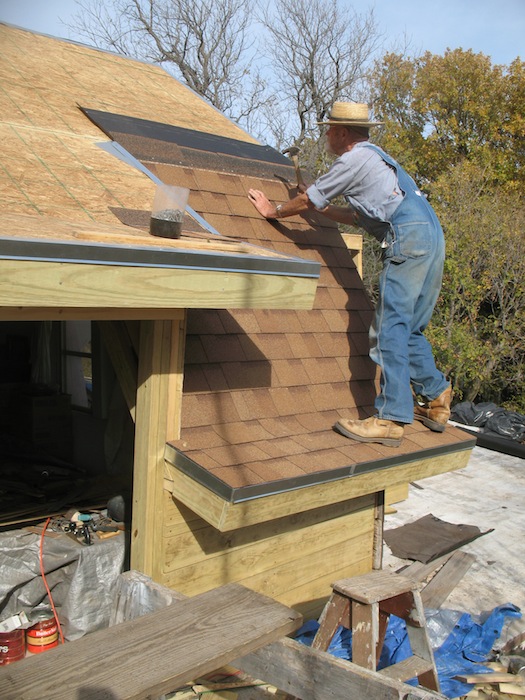 slope on the west end, cutting and fitting shingles, slathering a bead