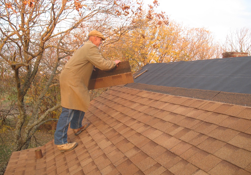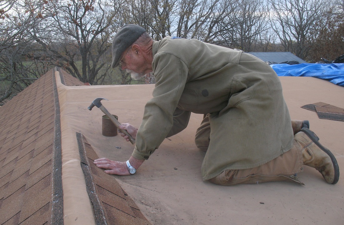 them up on the upper eaves, then going up and nailing all of them on the roof. But when the wind started picking them up