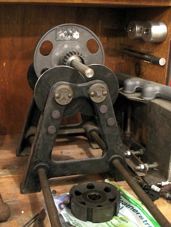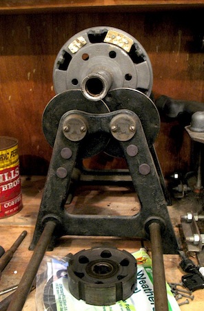 A blustery day had me in the shop today, mostly working on transmission cover assembly. The low pedal didn't want to fit on its new shaft, so I used one of the adjustable reamers for the first time. I've had them for several years but never had occasion to use them, so it took me a few minutes to figure out how they work. I got the clutch shaft installed in the hogshead, and got the low pedal and shaft together, painted them and some other parts, and put them in the oven to bake. The last job of the day was putting away tools and parts, bringing a trace of order to the rampant chaos. There's a huge amount of sorting and organizing to do, because there are parts I'm sure I have and not a clue where they are. |