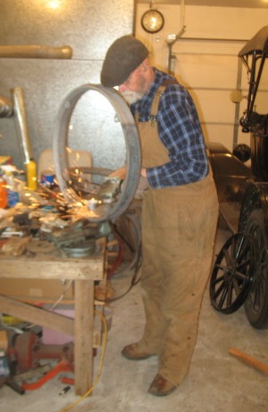 I started the day getting ready to reinstall the rebuilt rear axle in the car. At noon I drove over to Oxford to see if the Patterson auction had anything I wanted. Again the answer was no, so I came home and spent the rest of the day on the car. I got the driveshaft and axle back in. Now I have to put in the oil, remember where I put the brakes and reinstall them, and put the wheels back on. With any luck I'll get that done tomorrow and take a test drive. Monday, January 9, 2012 This morning I was up at 5:30 and in the shop before seven, and spent the day on the touring car. I reinstalled the brakes, put on the rear wheels, adjusted the brakes, put in cotter pins where they were missing, filled grease cups, and borrowed a carburetor off the roadster because I know it's one that works. I ended the day replacing the copper fuel line with a steel one, because copper tubing sometimes breaks from metal fatigue. I usually knock off work at five, but I stayed at it another half hour today because I wanted to finish that fuel line. There are just a few more little chores to do, then I should be ready for a test drive to try out the new rear axle. Tuesday, January 10, 2012 This was a busy day. In the morning I put six empty gas cans in the truck and made a fuel run down to the casino. That's the least expensive gasoline in the area. I filled the truck and filled the cans. Those thirty gallons will keep the yard equipment going for another few months. Back home I got in the shop and spent a few hours cleaning up the touring car and the area around it. By late afternoon I was finally ready to start up the car and take it for a test run. I drove into town to buy groceries, and it ran well. But on the way home I found that the right front wheel was wobbling. When I got back I jacked up the front end and found that the wheel is loose on the spindle. So tomorrow's assignment is to take the wheel off and see if the bearing is toast. |