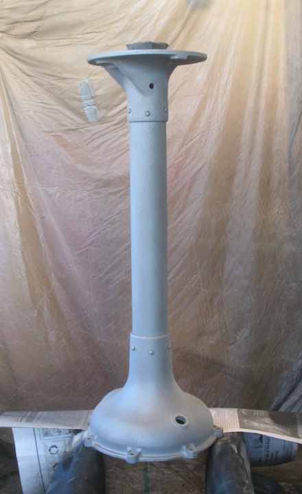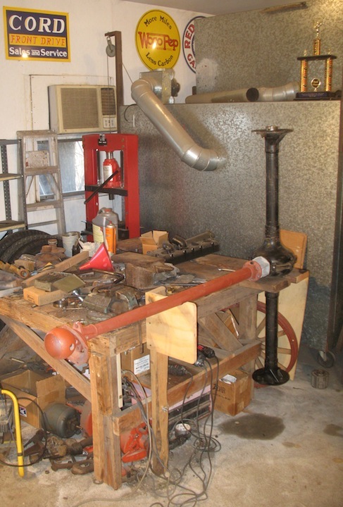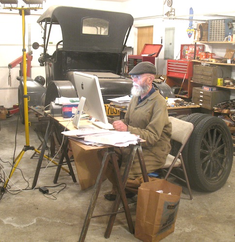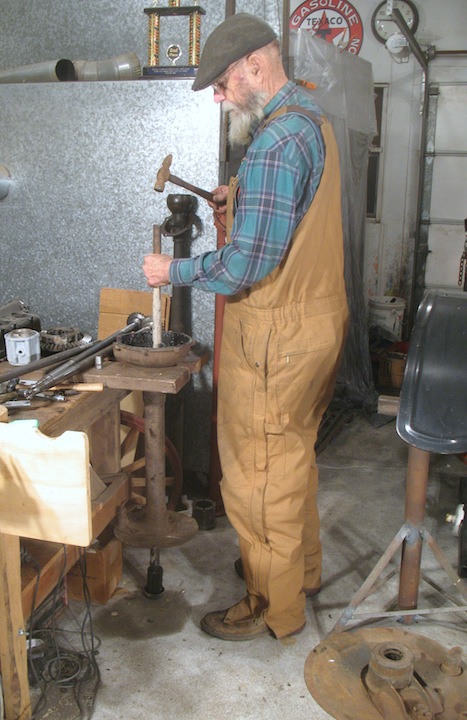 Never went off the place today. My first job was making a drive shaft tube support that bolts to my work table. That's part of rear axle rebuilding. Making the support used up most of my morning, proving once again that everything takes longer than you think it will. About one I went out and set up the sandblasting equipment and went to work on the right half of the axle housing. It was a pretty good day for blasting. Not too cold (above 45º) and with enough wind to carry away the dust so I didn't have to wear the hood. After awhile the wind died down and I had to use the hood. That slowed me down just because it's harder to see what I'm doing when I have it on. I kept at it and had the piece finished and the equipment put away by four. This evening I painted that half, and with any luck tomorrow I'll get the left half blasted and painted. Wednesday, January 15, 2014 The great taking-apart continued this morning. The biggest part of that was the drive shaft, especially getting the pinion gear off the end. I tried three different three-jaw pullers, and all of them proved to be feckless junk. So I went online and found a very simple method from Stan Howe, a Model T guy who knows his stuff and has lots of good ideas. I had the gear off in a couple of minutes. In the afternoon I turned again to sandblasting the left half of the axle housing. There was no wind today to carry away the dust, so I had to wear the hood the whole time. The cold air blowing into the hood turned my nose into a snot fountain, so it was slower going than yesterday's session. I got the ends , the hardest part, almost finished. The next session should finish up the whole thing. After I get that left half blasted and painted so it can be drying, I'll get started on the nuts and bolts and other small parts. |