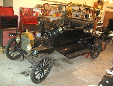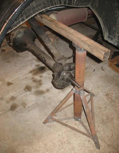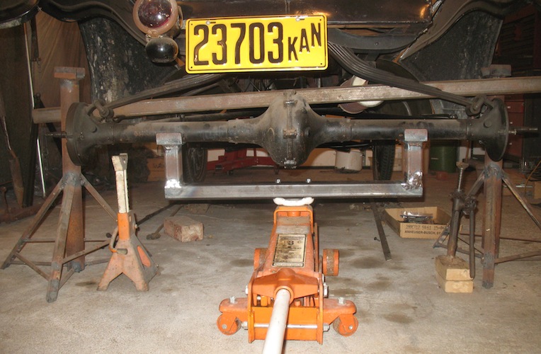 I never went off the place today. My main project was making a jack attachment. It's bad practice to raise the rear end of a Model T by placing a jack under the center, so I came up with a way for a single jack to lift in two places. With that tool finished, I used it to put the rear of the roadster up on jack stands. With a length of square tubing under the frame and between the muffler and the spring, the rear axle is easily removed. Just disconnect the brake rods and shackles, remove four bolts from the front of the drive shaft housing, and the whole thing pulls out toward the back. Soon I'll have that rear axle out and can open it up to see what's inside. I suspect I'll find some of the old babbitt thrust washers that need to be replaced. While I have the rear axle out I'll install the proper 1915-style rear spring, shackles, drive shaft tube, and pinion spool. |