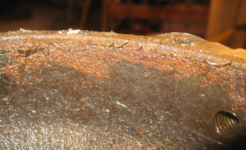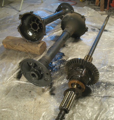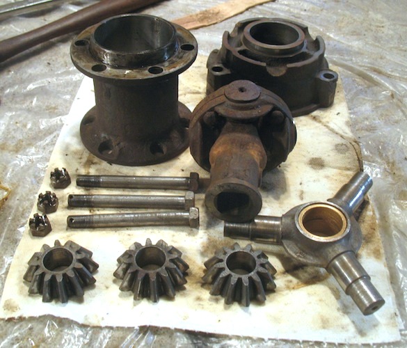 Today I dug into that rear axle and was delighted to find that most of the parts I checked were OK. The thrust washers are bronze, not the notorious babbitt type. Three of the four axle bearings are good to excellent. The fourth has too much wear, so I'll replace it. I guess whoever rebuilt this axle couldn't find a better one. If all the other parts in this axle check out as well as the ones I've measured so far, I'll be a happy camper. Sunday, January 12, 2014 Today was perfect for sandblasting, with mild temperatures and enough wind to carry away the dust. Unfortunately I didn't have any parts ready to blast. The forecast is for more good weather in the coming week, so I'll do my blasting then. I drove up to Winfield and over to Oxford to check out the auctions, and found nothing to keep me at either one, so I came home and did more rear axle dismantling. I found that enough water had found its way into the housings to cause some rust, so I'll be sandblasting for sure. This rear axle has been rebuilt before. It was recently enough to have neoprene seals and blue goo inside, but far enough back to have spiral grooves in the thrust washers. The current thrust washers have straight grooves. |