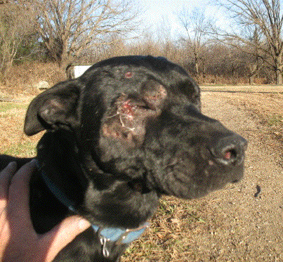 When I got home from work this afternoon Zeke showed up with a seriously chewed up face. When I first saw him I thought he might have become a one-eyed dog, but it appears there's still a good eye behind the lacerations and the swollen face. I'll keep him inside overnight and take him to the vet tomorrow.