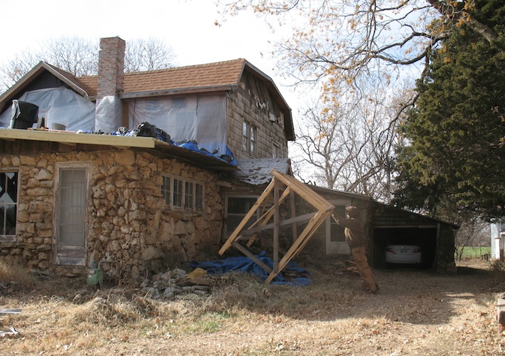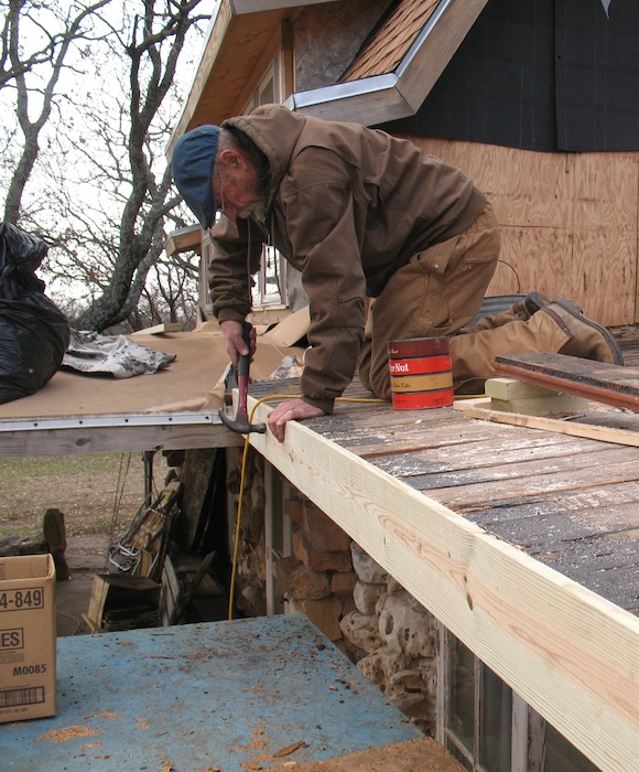 | Tuesday, December 2, 2014 Today I moved one of the shorter scaffolds from the east side of the house to the north side. I had planned to get started on fixing/rebuilding the north edge of the roof, but didn't get much done on that other than moving the tarps out of the way. I had to go to town to buy screws for the job, and get celery, and stop at the lumber yard to order another eighteen-foot 2 x 6. When I got home I got sidetracked on another job, taking down screens and putting up storm windows in the living room. I should have done that a month ago, but kept putting it off in favor of more pressing matters. Tomorrow is supposed to warm up to the forties, so I should get a lot done on that north edge of the roof. Wednesday, December 3, 2014 This was the day to get some serious work done on the north end of the roof. I cut a long board to go under the outer ends of the eaves. All the boards will screwed to it to keep them even and the fascia will be nailed to it. I got it on and about half the boards screwed to it until I reached the place where I have to start replacing things. Four of the roof boards are rotten and/or warped at the outer ends, so I have to cut and remove the outer three feet of them and put in replacement pieces. I'm using good parts of other old boards for that. I'm saving as much of the original lumber as I can. A challenge I'm going to face is finding a stain that will make the new lumber look like the original. |